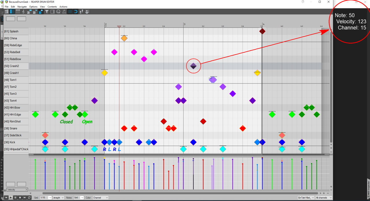 Editing recorded drum midi: ➜ Optimizing the REAPER Midi Editor ( = Drum Editor) 👉